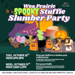 Wea Prairie is hosting a spooky Stuffie Slumber Party! Dress up your teddy bear and come to the library for a bag of treats.