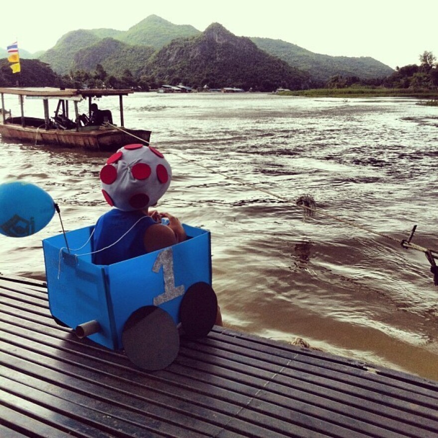This is where Japan constructed the "Death Railway" during WWII. This was taken on the River Kwai in Kanchanaburi, Thailand, the setting for "The Bridge on the River Kwai" where thousands of POWs and Asian laborers lost their lives building 250 miles of railway from Thailand to Burma. Now you can charter barges to float down the river.... Even while dressed as Toad from Mario Kart. (@merylfranco)